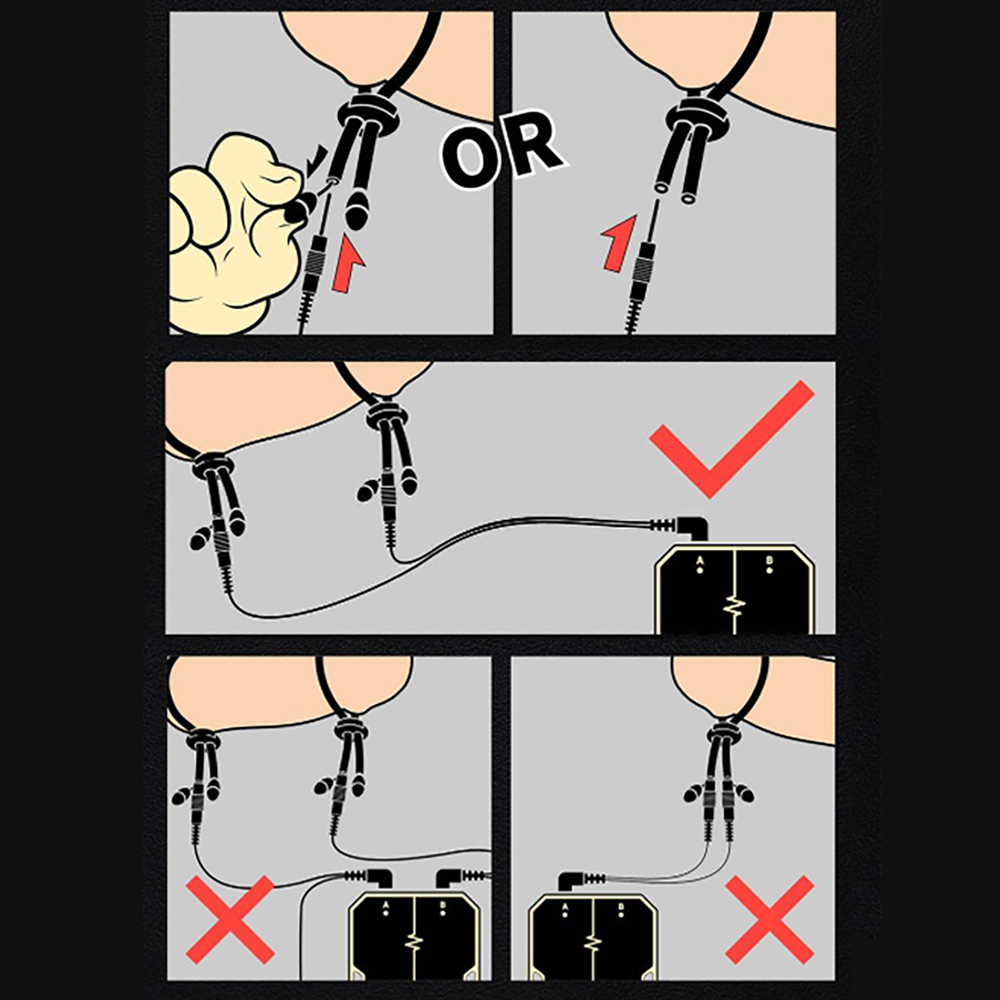 2. De twee elektrodenaalden van de dubbele elektrodedraad moeten in aparte rubberen ringen worden gestoken. (Steek niet beide naalden tegelijkertijd in de twee uiteinden van één ring, dit veroorzaakt kortsluiting.)