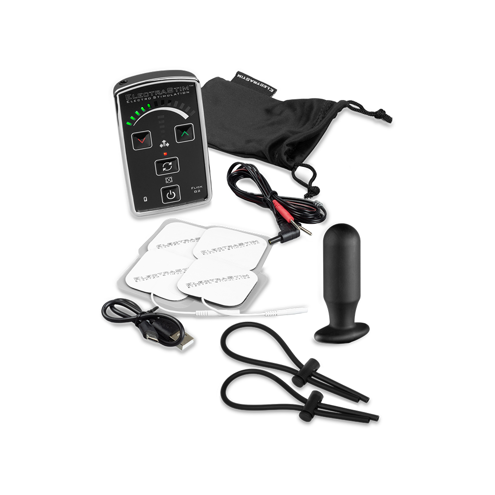 Het ElectraStim Flick EM60-M pakket bevat een stimulator, alle benodigde kabels en een set van 4 ElectraPads, 2 ElectraLoops verstelbare cockringen en een siliconen Noir Aura elektrode (geschikt voor vaginaal en anaal gebruik).