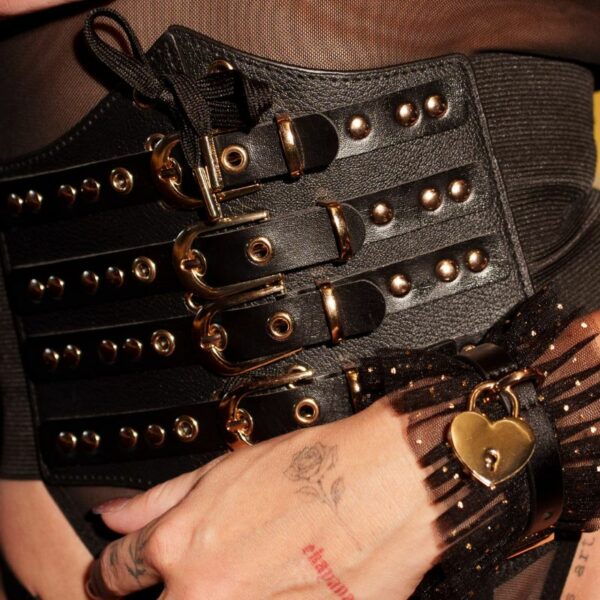 Deze cincher is gemaakt met een elastische band die niet beperkt wordt door de rekbaarheid tot 15 cm, waardoor hij met je meebeweegt en je figuur accentueert. De opvallende voorkant met 4 gespen voegt een stoere, modieuze touch toe die perfect past bij een strakke blouse of je favoriete Kinky Diva Essentials.